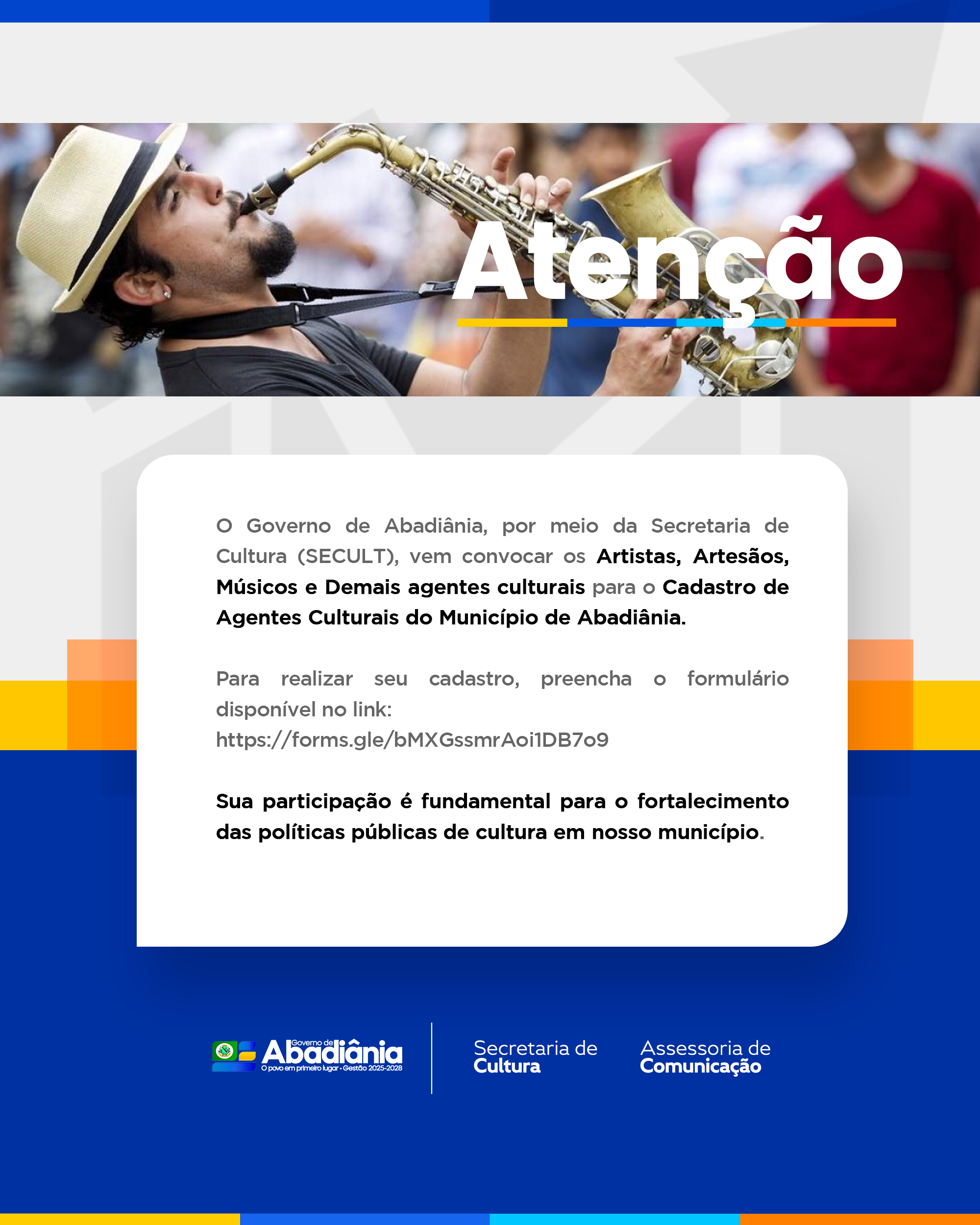 ATENÇÃO! O Governo de Abadiânia, por meio da Secretaria de Cultura (SECULT), vem convocar os artistas, artesãos, músicos e demais agentes…