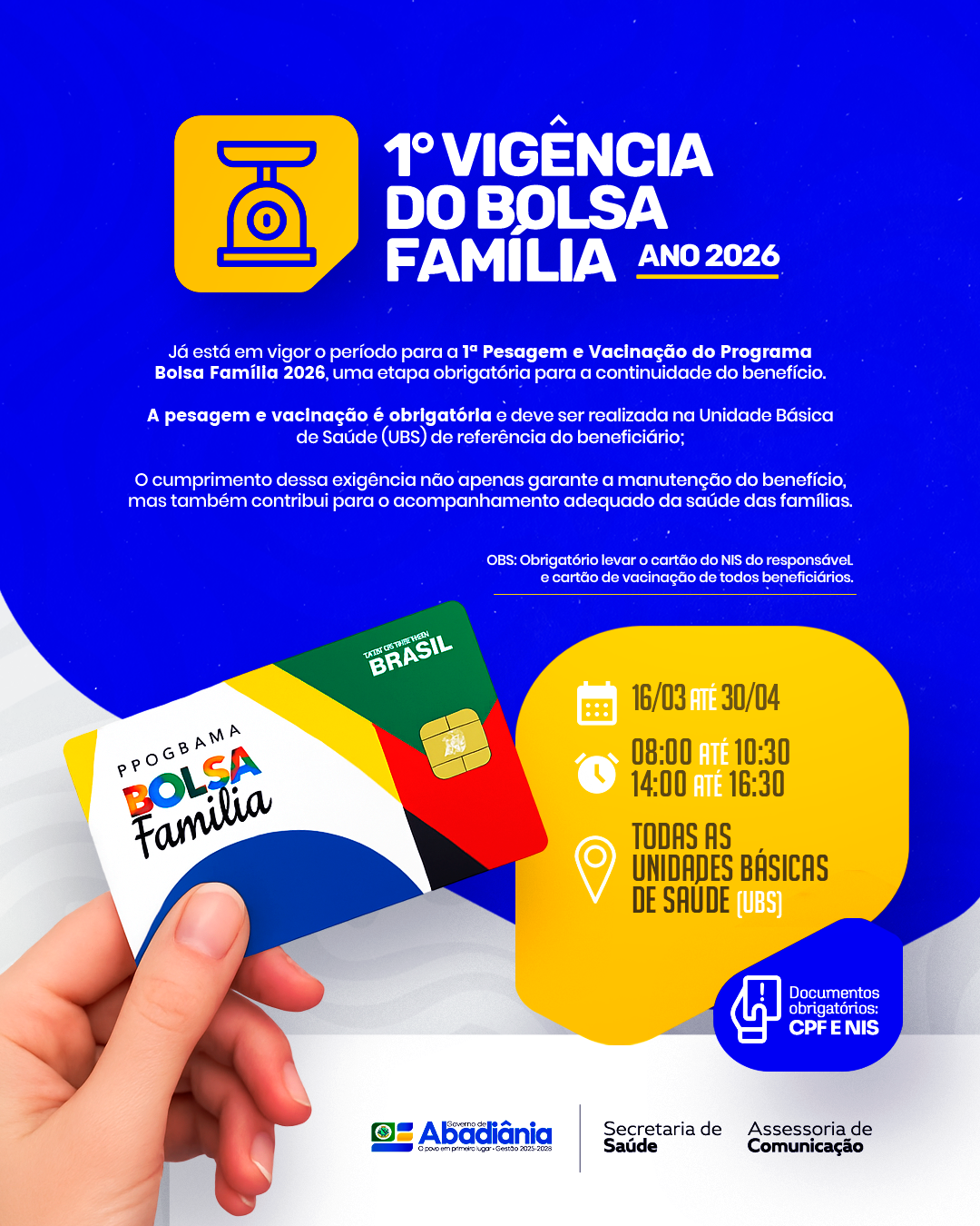 📢 ATENÇÃO FAMÍLIAS DE ABADIÂNIA A Coordenação do Cadastro Único e do Programa Bolsa Família convoca as famílias beneficiárias, com…