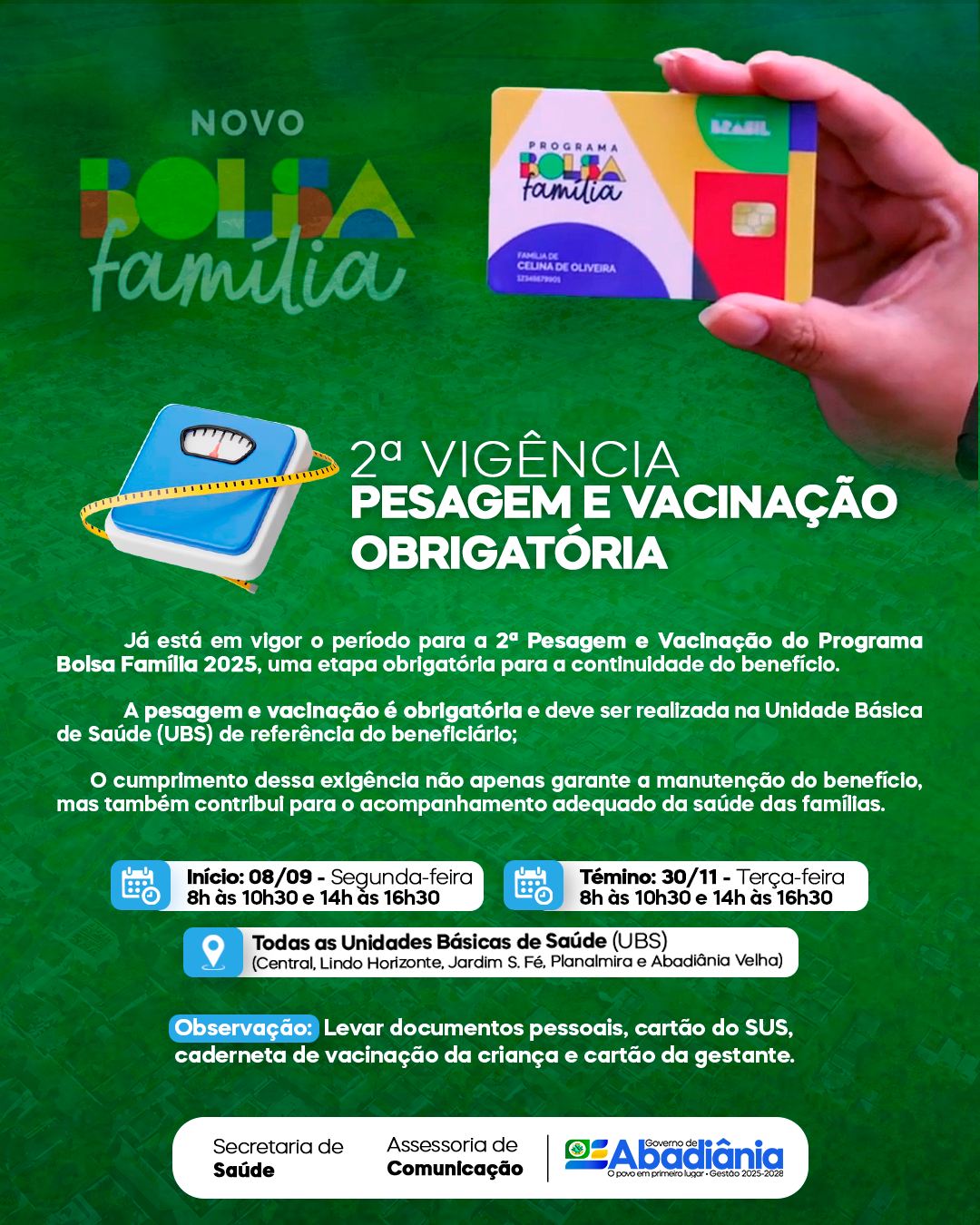 O Governo de Abadiânia, por meio da Secretaria de Saúde, informa que já começou o período da 2ª Vigência de Pesagem e Vacinação obrigatória. ✅