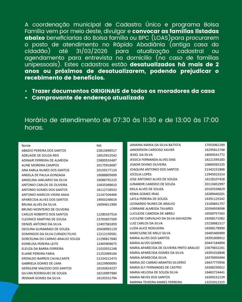 A Coordenação do Cadastro Único e do Programa Bolsa Família convoca as famílias beneficiárias, com cadastro desatualizado, a comparecerem ao Rápido Abadiânia (antiga Casa do Cidadão) até 31/03/2026 para atualização cadastral ou agendamento de entrevista domiciliar (famílias unipessoais).