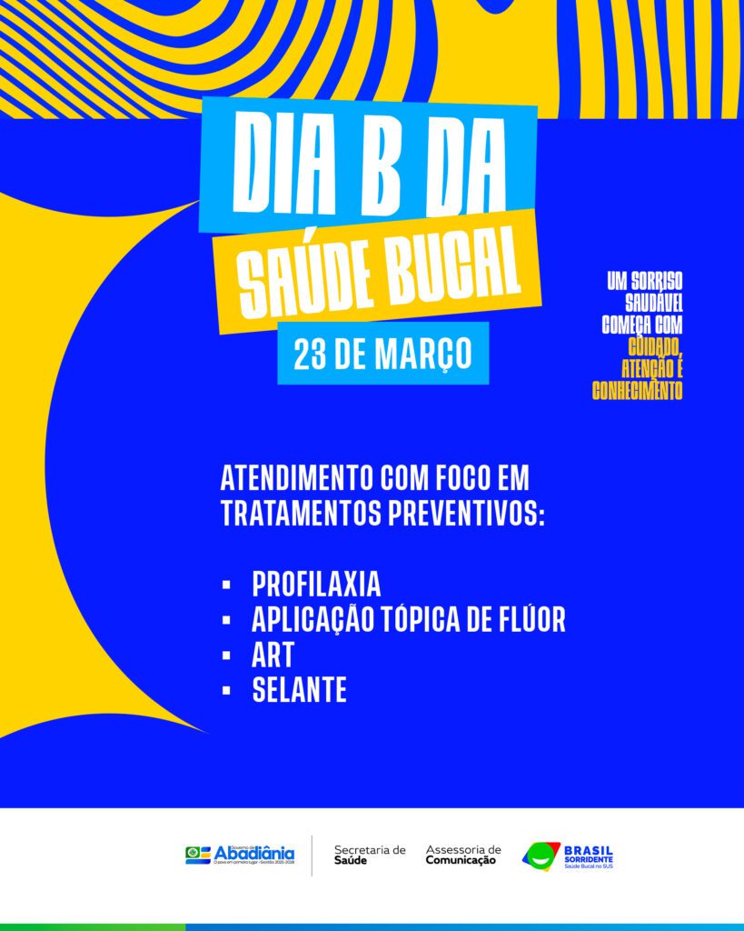 O Governo de Abadiânia (GO) aderiu à mobilização nacional do Dia B de Saúde Bucal , promovida pelo Ministério da Saúde por meio do programa Brasil Sorridente , com o objetivo de fortalecer as ações de promoção, prevenção e cuidado em saúde bucal.