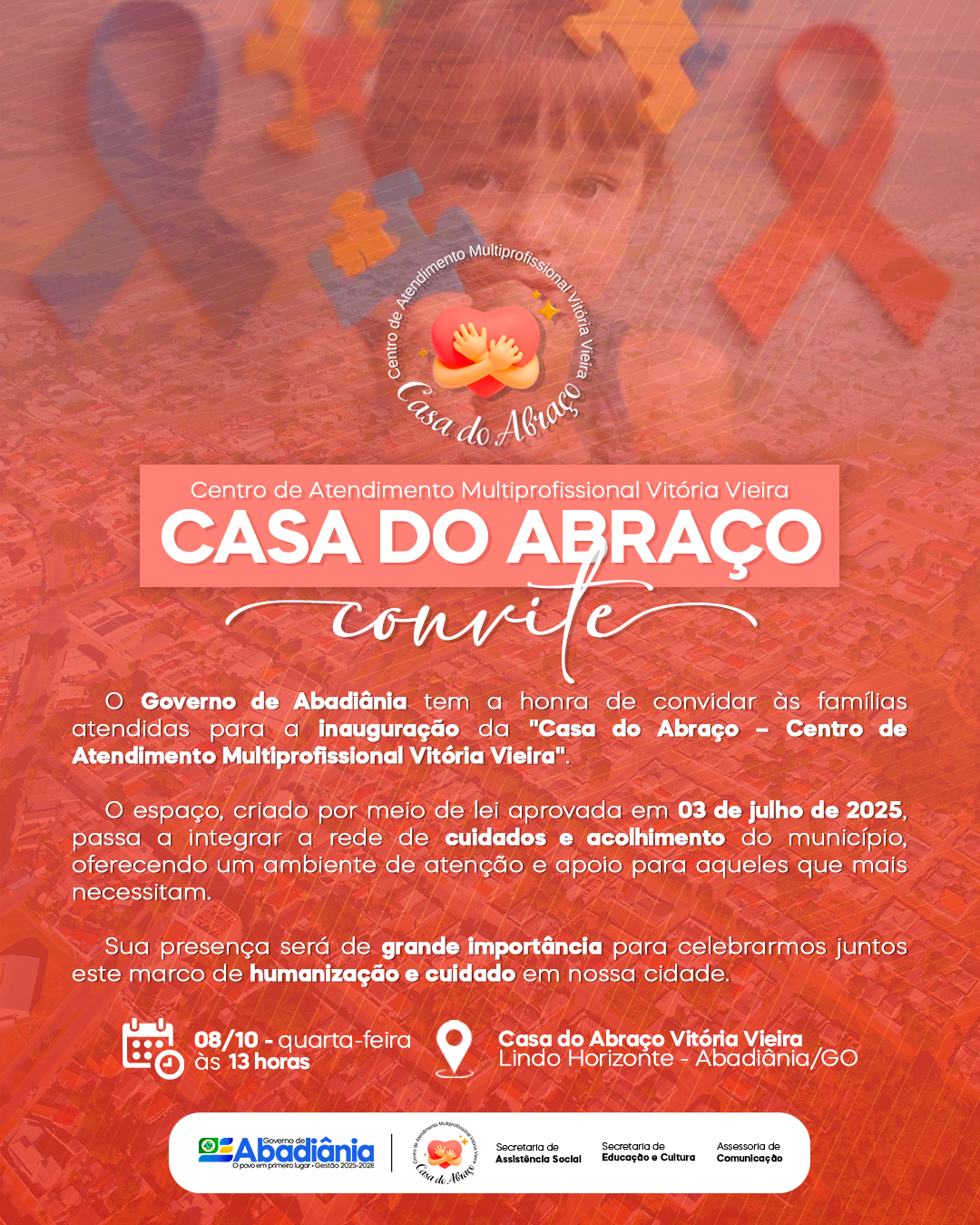 O Governo de Abadiânia tem a honra de convidar às famílias atendidas para a inauguração da “Casa do Abraço – Centro de Atendimento Multiprofissional Vitória Vieira”.
